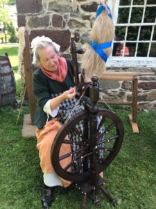 In addition, Celeste Sherry will be demonstrating the Irish domestic art of fiber spinning. She dresses as a middle-class woman of the late 1700s in accurately researched garments as she describes and demonstrates the historical development of Irish wool & flax (linen) spinning, from Neolithic times to the present, on the spinning wheel & drop spindles. The 1886 spinning wheel she uses is an upright double-drive wheel, sometimes known as an “Irish Castle wheel.” Questions during her demonstration are encouraged and welcomed, and attendees may try their own hand at spinning wool on a drop spindle.